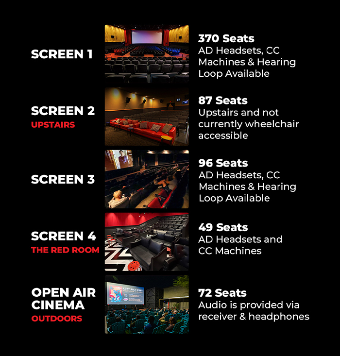 The Loft Cinema offers open captioned screenings for all films that have that option. These screenings are clearly marked on individual film pages when they are available or they can be found here.