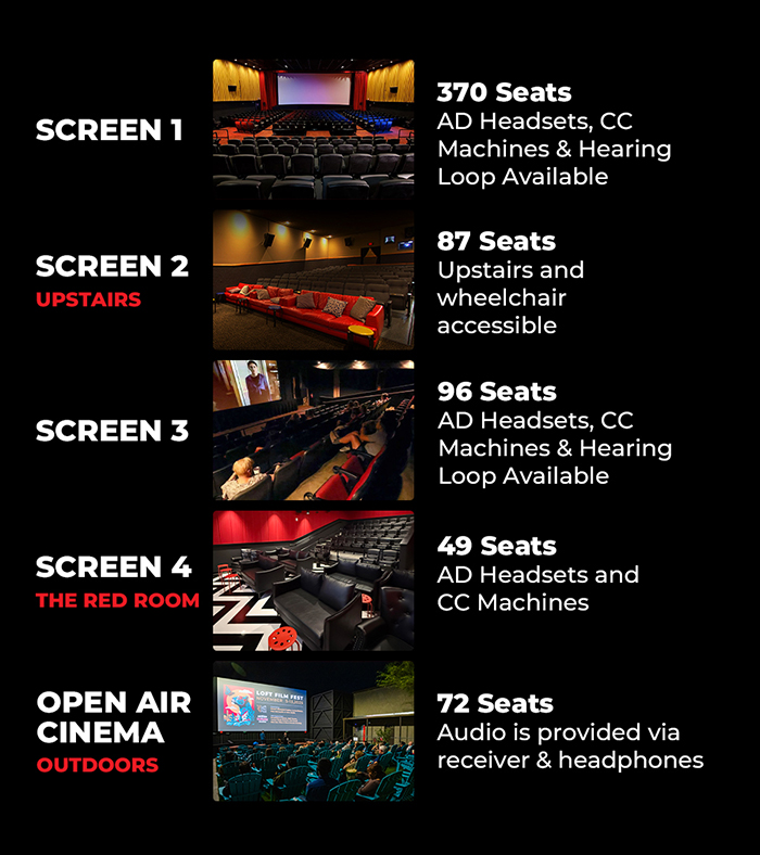 Each of our 4 theaters are available for rentals, as well as our Open Air Cinema and Overlook Lounge!